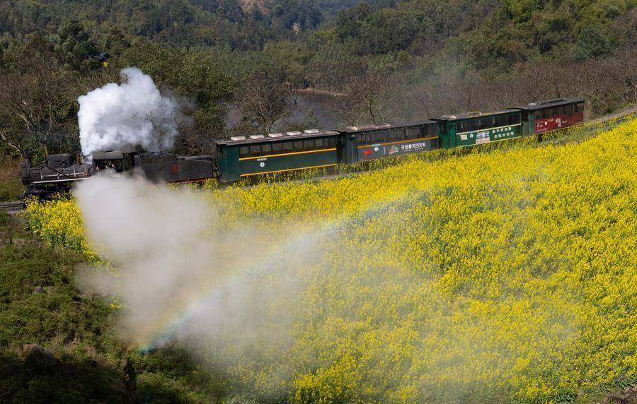 在四川省乐山市犍为县芭沟镇,小火车行驶在油菜花田中(3月4日摄)。新华社发(陈大康摄)各地努力把美丽生态“颜值”转化为经济“产值”。在乐山市犍为县,“开往春天的小火车”吐着白色蒸汽穿行油菜花海,载着游人缓缓行驶;绵阳市北川羌族自治县永昌镇高安村推出“马上赏花”沉浸式新玩法,开园首日吸引游客超万人次。