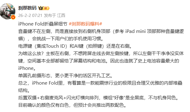 爆料显示,iPhone Fold的音量键将突破常规布局,从机身左侧移至右侧顶部,采用与iPad mini类似的顶部按键逻辑。这一调整源于苹果对内部结构的极致优化——由于主板集中于右侧机身,为避免跨屏走线,左侧区域完全取消实体按键,仅保留屏幕与电池结构。这种设计不仅使左侧边框更加简洁,更腾出空间容纳更大容量电池,有望成为“史上电池最大的iPhone”。
