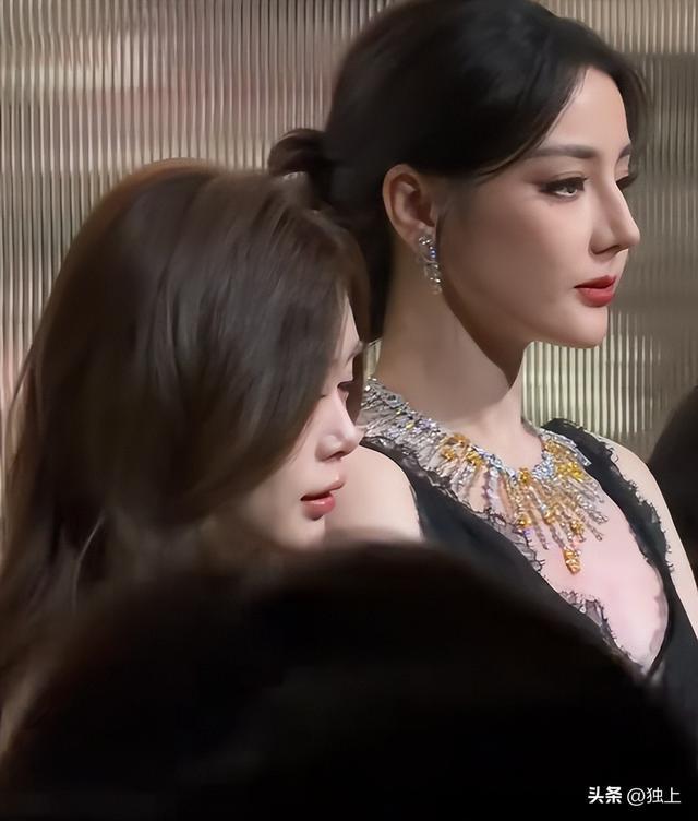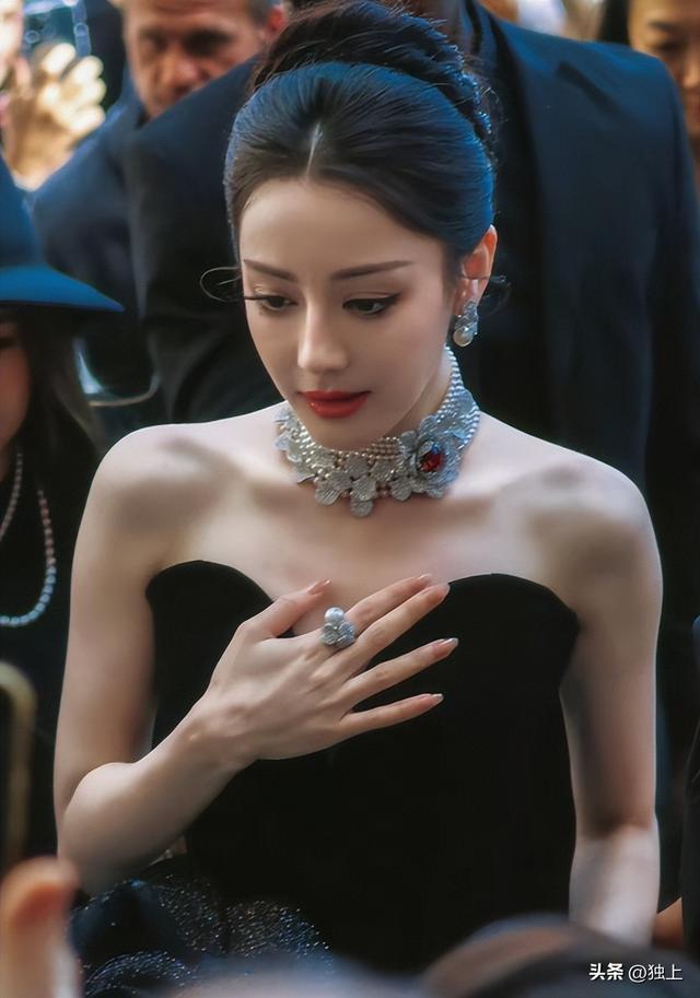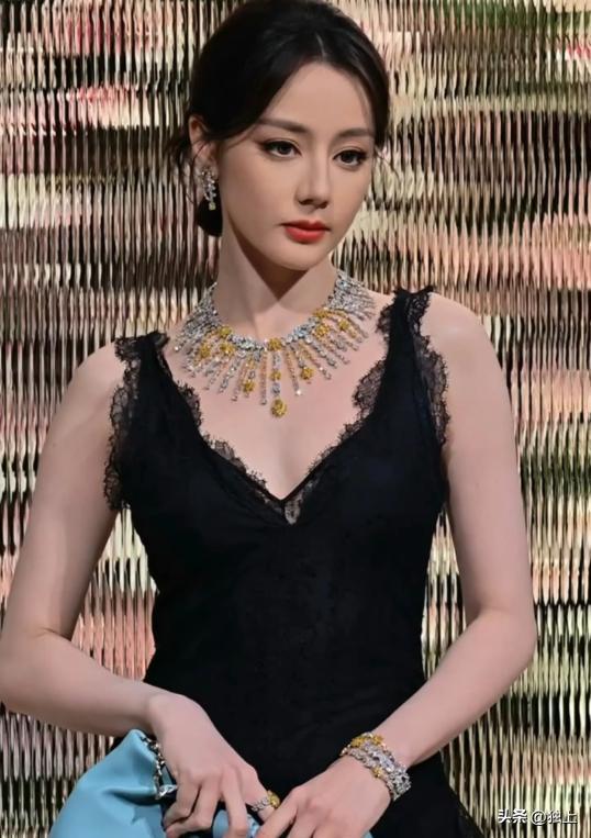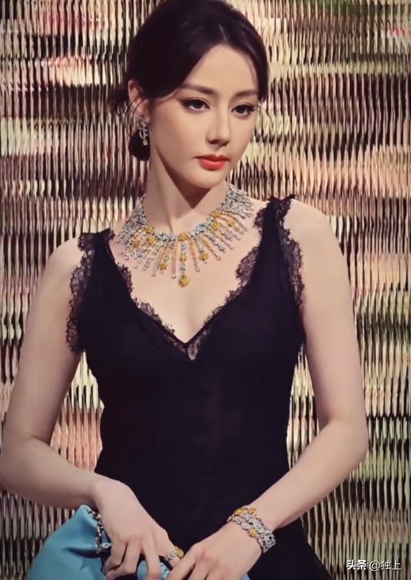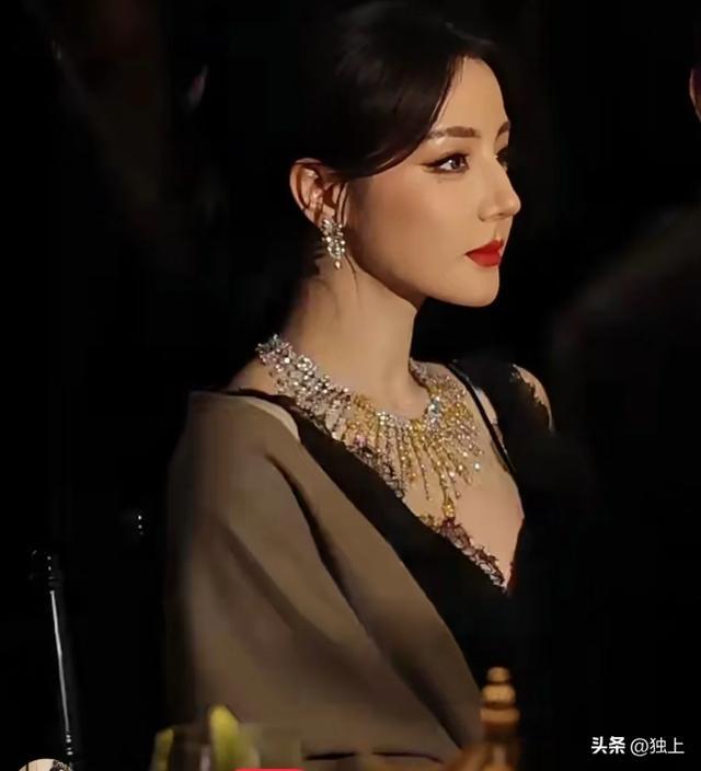 热巴脖子上戴的是品牌主推的珠宝,宝石散发着火彩,热巴并没有被脖子上的宝石夺走眼光,所有的人都把目光放在了她身上,忽略了她身上的珠宝,美的压过了宝石。